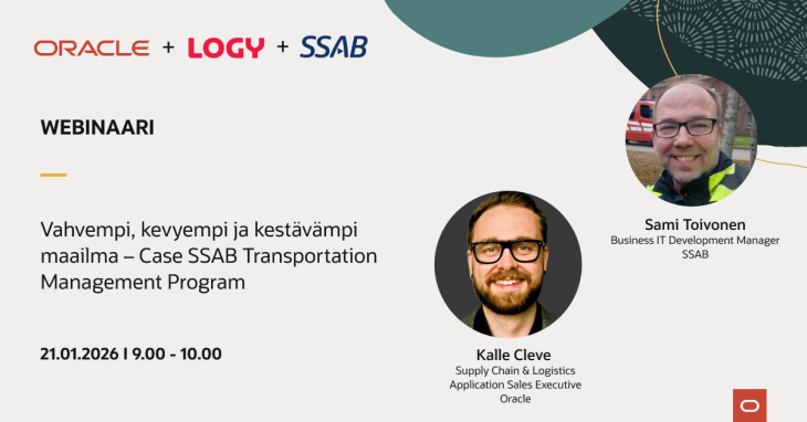 Tule mukaan LOGY:n webinaariin kuulemaan, miten Oracle ja SSAB rakentavat yhdessä tehokkaampaa ja kestävämpää logistiikkaa modernin kuljetustenhallinnan avulla. Moderni TMS tarjoaa yhtenäisen alustan koko kuljetusketjun hallintaan – suunnittelusta ja toteutuksesta laskutukseen ja analytiikkaan. Järjestelmä auttaa vähentämään logistisia kustannuksia, parantamaan toimitusvarmuutta ja lisäämään toimitusketjun joustavuutta yhdistämällä ihmiset, prosessit ja teknologian yhdeksi tehokkaaksi kokonaisuudeksi.